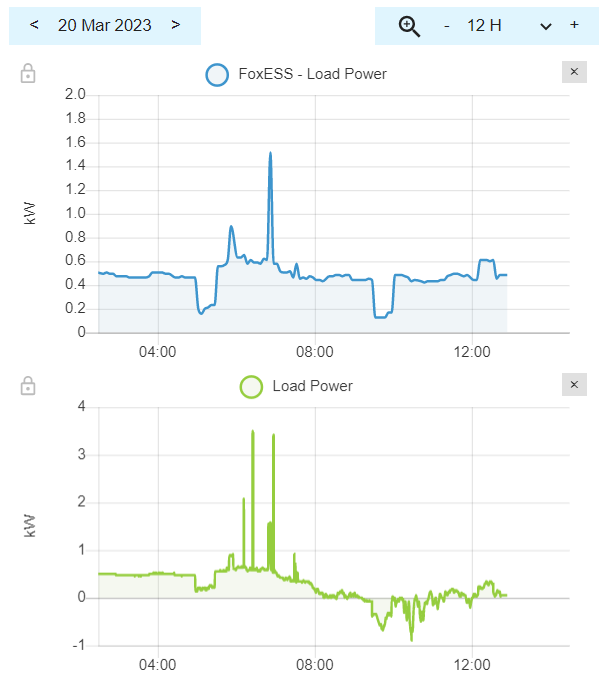 In the charts below the blue line is the Load Power from the Cloud based HA integration and the green line is the Modbus HA integration.