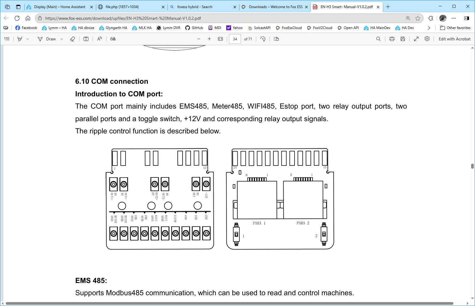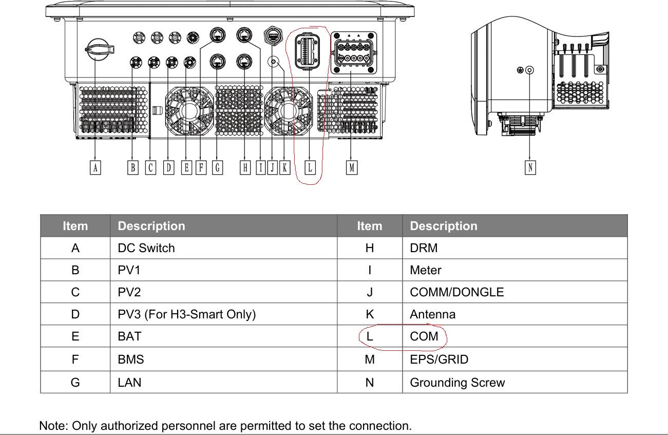 I would like to ask you about the wiring of the COM connection. I am looking at the COM port at the inverter and I see 24Pins (as mentioned in the manual for the H3-12.0 Smart). I am confused by where to connect any wires for the 485A and 485B since in the manual under 6.10 are only 16 slots shown and named. Is it possible that there should be a plug for the COM port that has a different pinout then the COM port directly at the inverter through which I need to connect the Elfin wires?