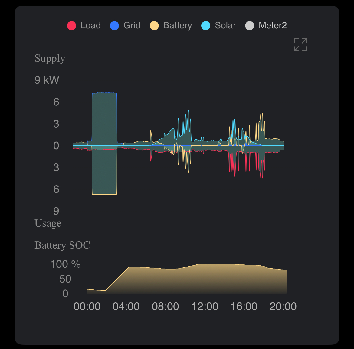Could you post a picture of the graph in the app for a typical day - swipe left off the home page, scroll to the bottom of the page and screen shot the graph with load, battery, grid and battery soc