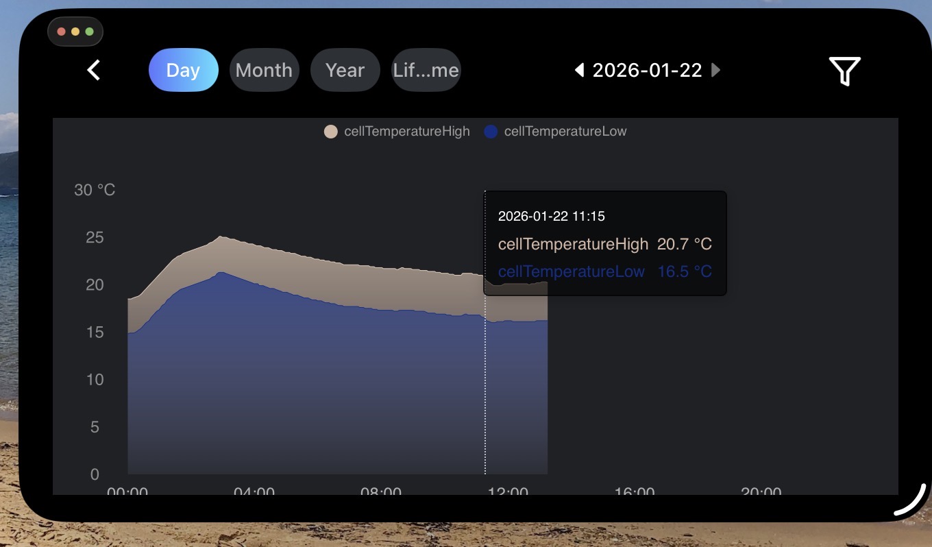 Added to graphs, a track of battery temperature inline with displayed value on the app, and a log of when warming kicks in and out.