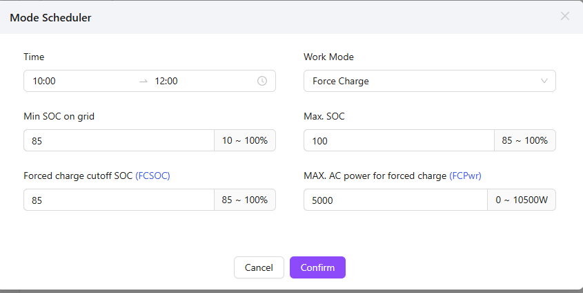 Between 11am-4pm I want the battery to always remain above 60%SOC. If the battery drops below 60% I want to force charge from the mains until it gets to 80%SOC. When it reaches 80%SOC, it should revert back to normal (Self-Use mode). What are the settings to make this happen?