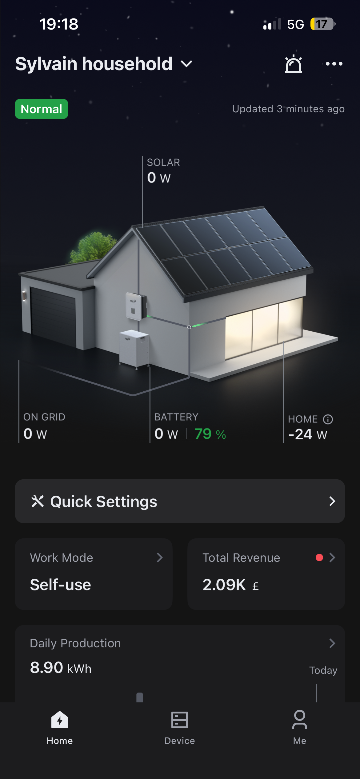 However on the app's home screen, all data (on grid, battery, solar, home) show 0W.