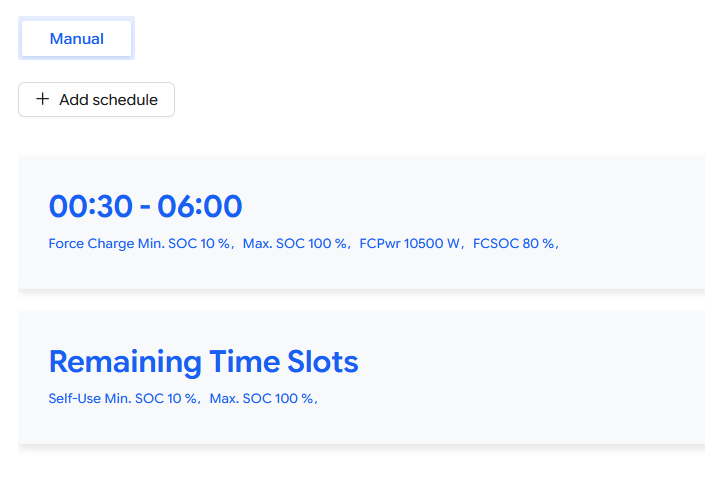 If that doesn't work, try changing Max SOC to 80% as well. I think I had to change both in the Force Charge schedule, but I can't remember nowjbeearr wrote: ↑Fri Mar 13, 2026 9:34 am This is all really helpful. Thank you.