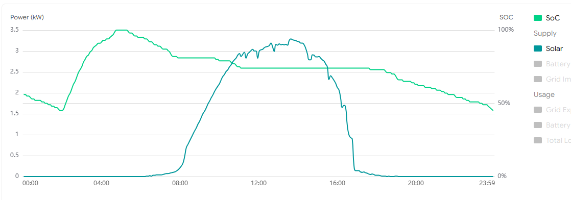 While it still discharges normally and charges from the grid overnight, it won't charge from solar. As soon as the sun goes down it continues to discharge until it charges from the grid between 2.00 and 5.00am.