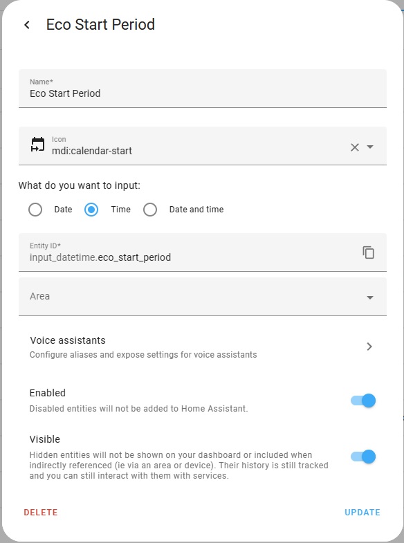 Once created, click on the Helpers and set them to your Eco tariff i.e. for Economy 7 it would be 1:30am for start and 08:30am for the end.