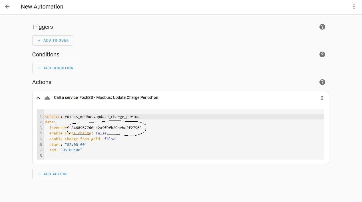 As the Inverter 'device' is also unique to your installation you will need to update the device name in the code with your inverter device - you can find your inverter device_ID by creating a new blank automation, click '+Add Action', and choose 'Call Service', in the 'Service' box start to type 'Foxess - modbus' and choose the item in the list 'FoxESS - Modbus: Update Charge Period'