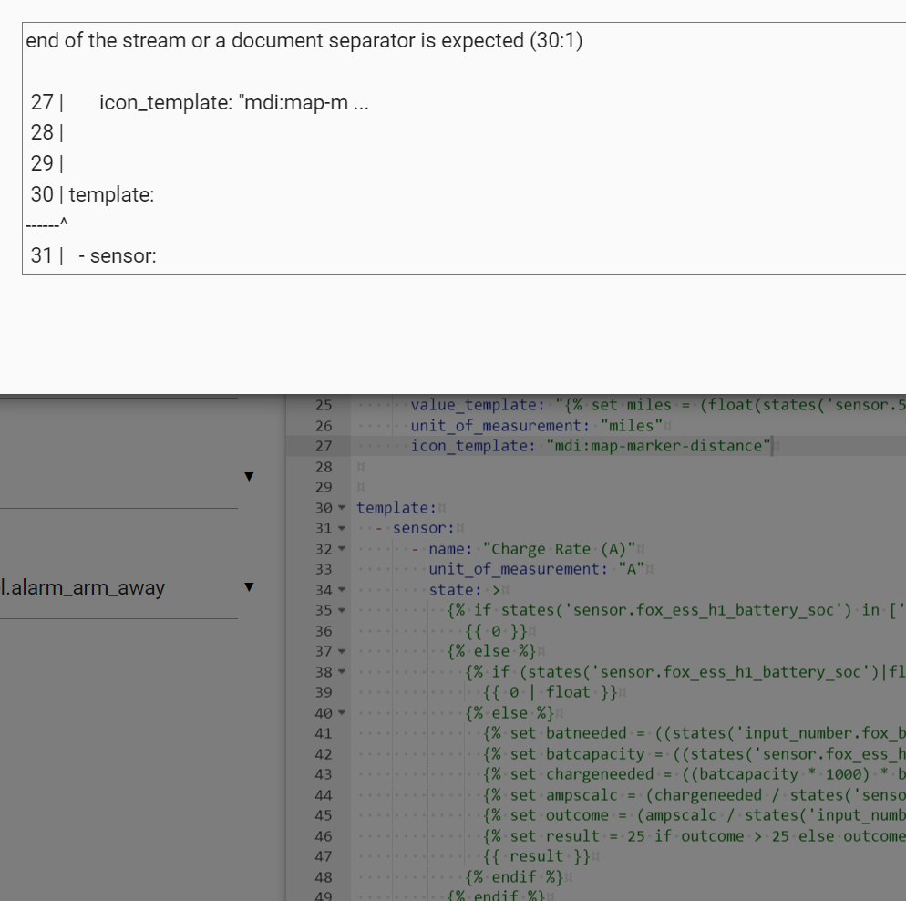 Cannot quick reload all YAML configurations because the configuration is not valid: Invalid config for [sensor.template]: expected dictionary for dictionary value @ data['sensors']['name']. Got 'Charge Rate (A)' expected dictionary for dictionary value @ data['sensors']['state']. Got "{% if states('sensor.fox_ess_h1_battery_soc') in ['unknown', 'unavailable'] %}\n {{ 0 }}\n{% else %}\n {% if (states('sensor.fox_ess_h1_battery_soc')|float > (states('input_number.fox_battery_overnight_setting')|float * 100)) %}\n {{ 0 | float }}\n {% else %}\n {% set batneeded = ((states('input_number.fox_battery_overnight_setting') | float - states('sensor.fox_ess_h1_battery_soc') | float) / 100) %}\n {% set batcapacity = ((states('sensor.fox_ess_h1_bms_kwh_remaining')|float / ... expected dictionary for dictionary value @ data['sensors']['unit_of_measurement']. Got 'A'. (See ?, line ?).