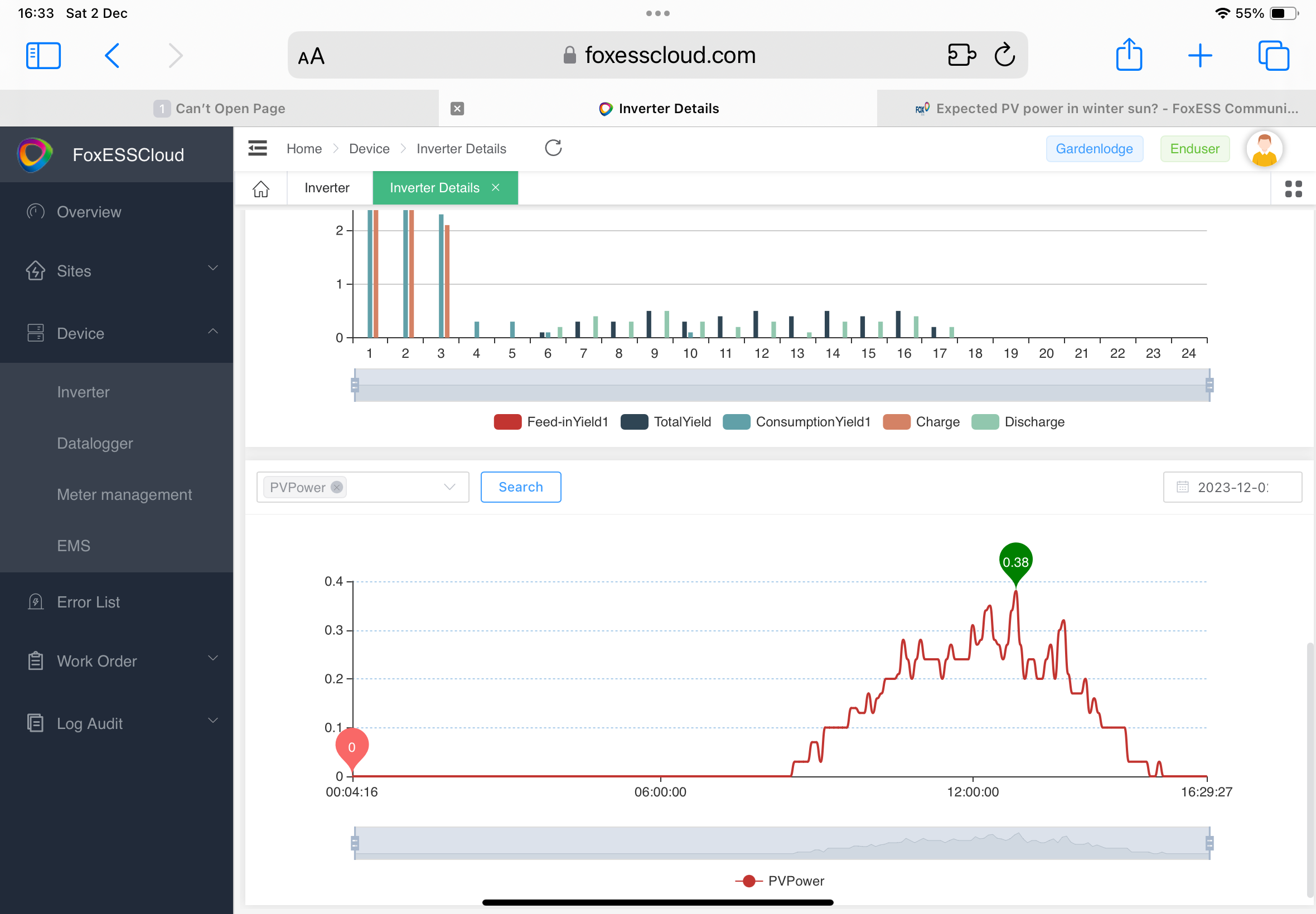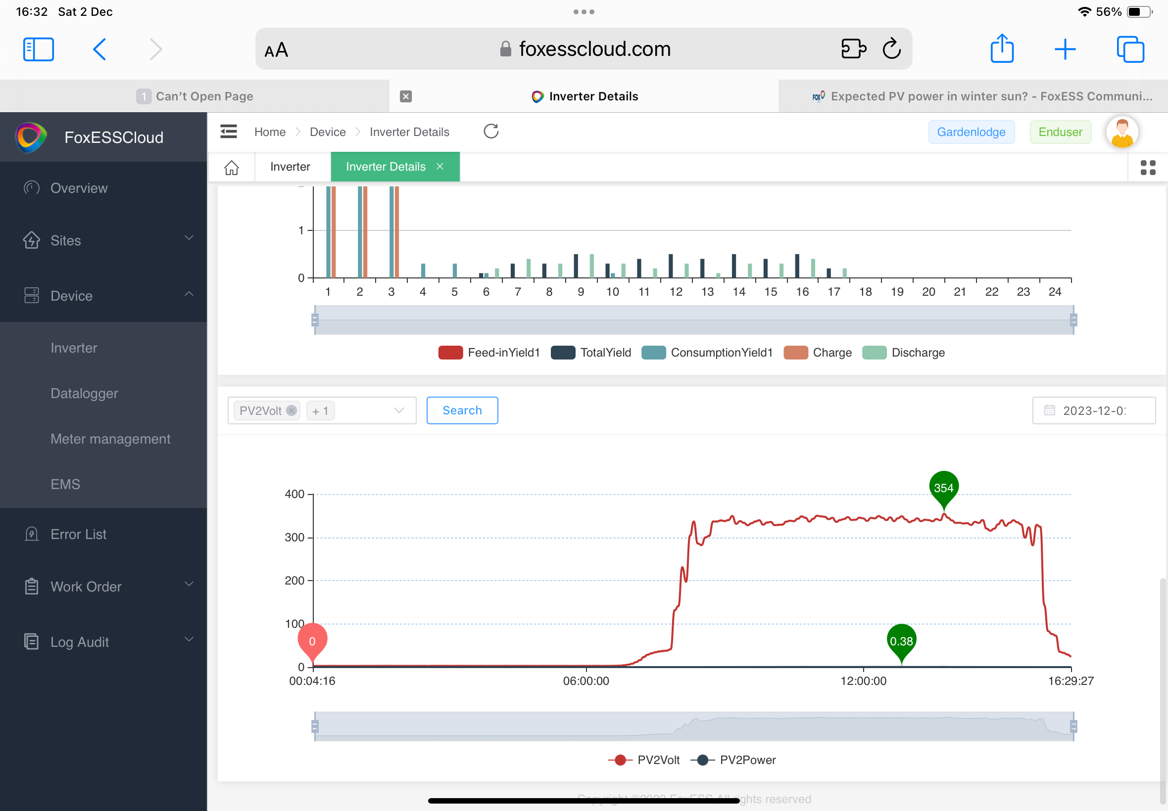 Obviously it’s difficult getting an accurate daily PV figure with Fox. The Energy Stats app doesn’t seem accurate as the estimated daily Solar number actually changes overtime (reduces) for example it will say something like 0.600kwh at lunchtime and reduce to 0.100 by the end of the day! Between 10am and 3pm the app is showing a snapshot PV of between 0.1 and 0.3Kwh. This is when the sun is visibly shining on the panels. I would have expected this to be nearer 1.0 KWh.