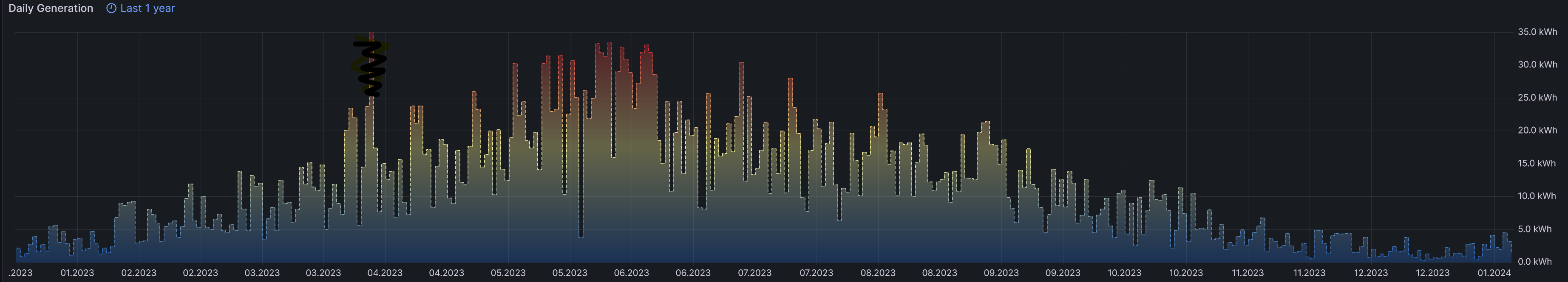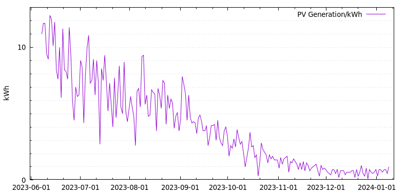 In case it helps, here is my daily PV generation over the last year. This system is 6x390W panels, 3 on the back facing ESE, 3 on the front facing WNW, all as a single string with 6 optimisers.