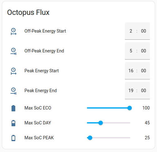 The idea for this comes from wanting to maximise the savings by charging on Octopus Flux while solar generation is low over winter. There's a lot of similarity here with Nathan Marlor's Octopus Energy Flux Tariff Automation which I started with to automate switching the Work Mode.