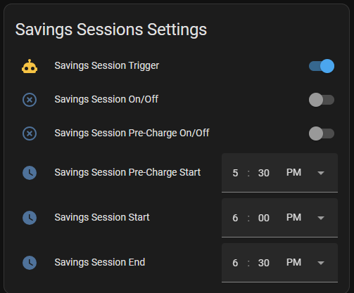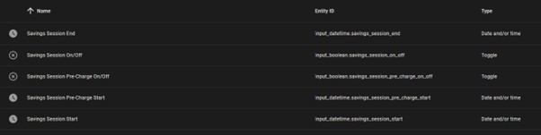 3) Pre-charge start time - datetime helper (set to time) named "Savings Session Pre-Charge Start"