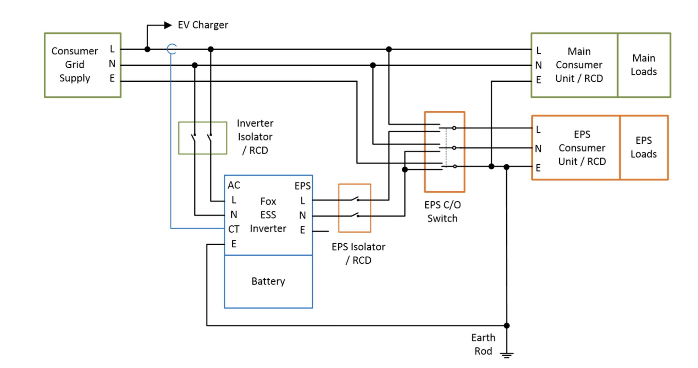 In your case you have located the EPS C/O switch in the main consumer unit (with the timed relay driving it) and the house load MCB’s are where the EPS consumer unit is, and your EPS CU would be where the EPS isolator is - note the EPS Earth is bonded to Neutral.