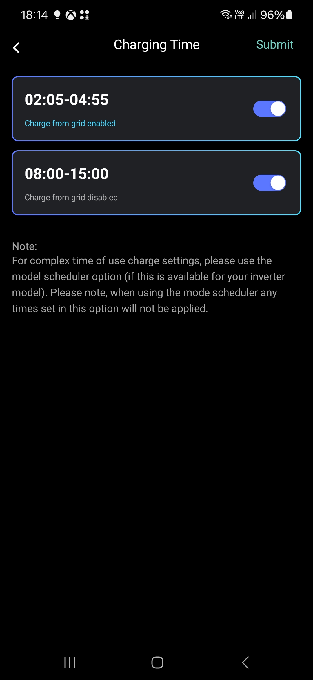 It was changed about 6 months ago, there used to be 2 switches one for charge from grid and the other enabled the ‘don't allow discharge’ switch - when both were off it used to reset the times to 00:00 which was quite handy.