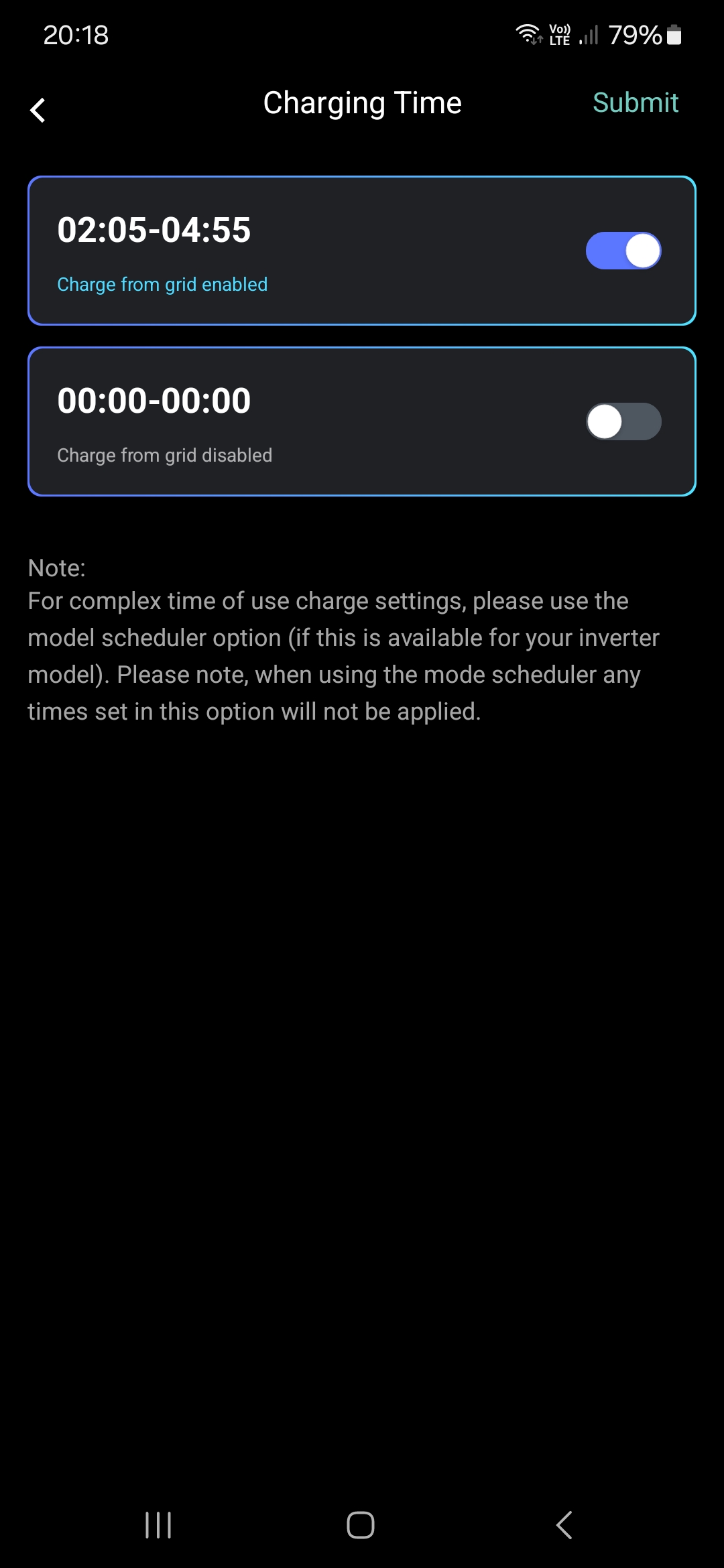 You only need the 02:05-04:55 period, the batteries will charge automatically from solar as long as the work mode is set to self-use.
